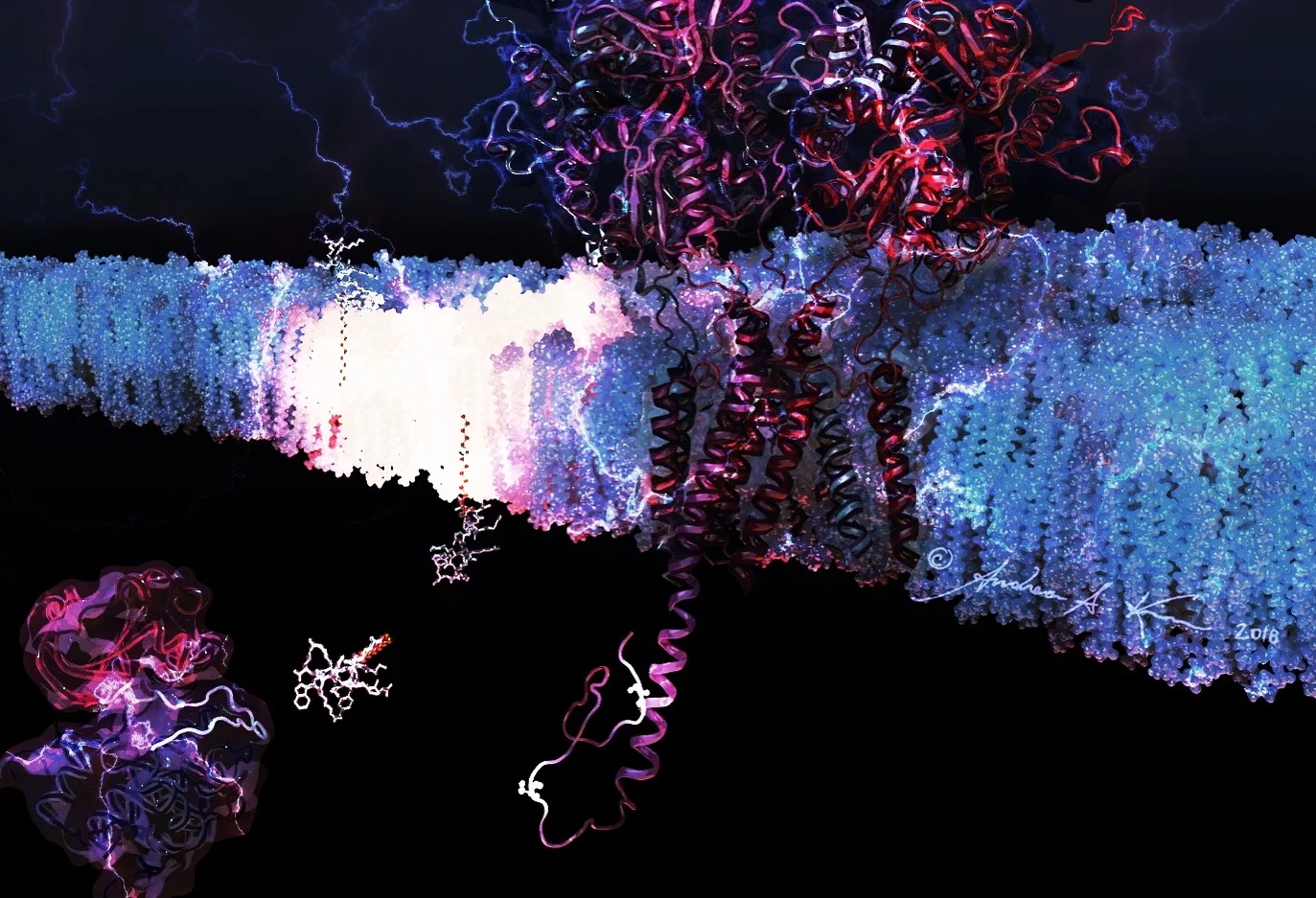 Everything starts with pencil on paper, and in this case, over 40 hours of scientific literature review! This piece was particularly difficult, as Uniprot (a database of protein sequence and functional information) and RCSB Protein Data Bank (a database for the 3D structural data of molecules) had mismatched mapping of the alpha-amino-3-hydroxy-5-methylisoxazole-4-propionic acid receptor (AMPAR - the biggest molecule in my scene!)